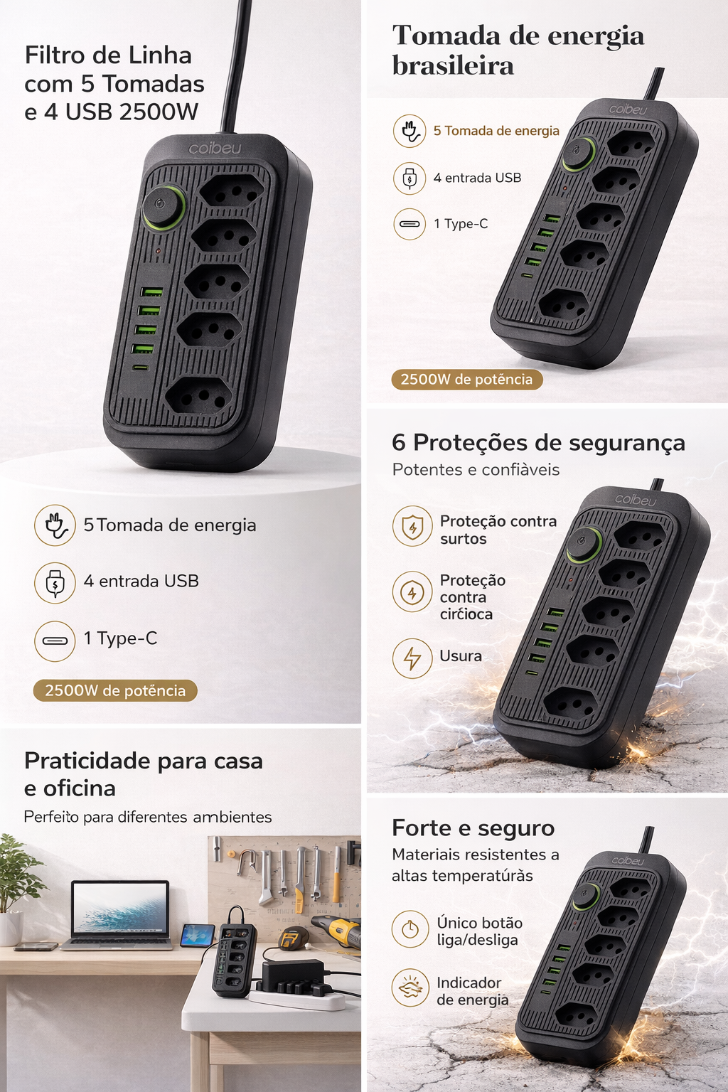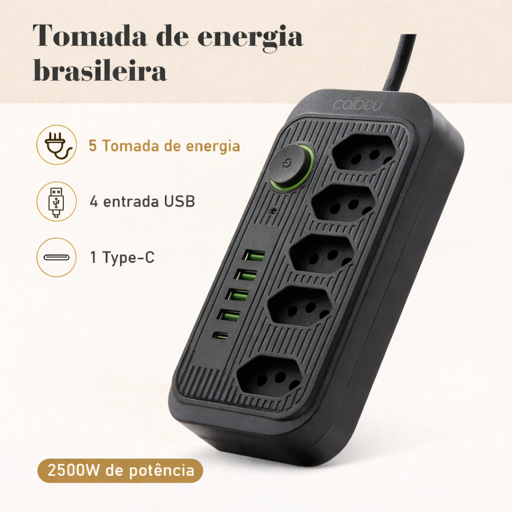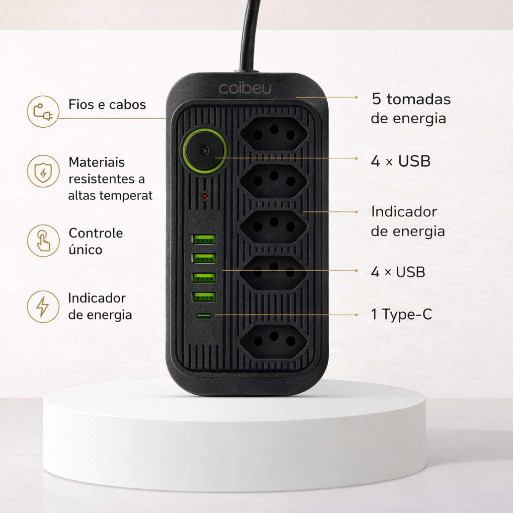 O Filtro de Linha COIBEU Modelo 614 foi desenvolvido para oferecer mais praticidade, segurança e organização para seus dispositivos eletrônicos. Com 5 tomadas de energia, 4 portas USB e 1 porta USB-C, ele permite alimentar diversos equipamentos ao mesmo tempo, sendo ideal para casa, escritório, setups gamers ou ambientes profissionais.