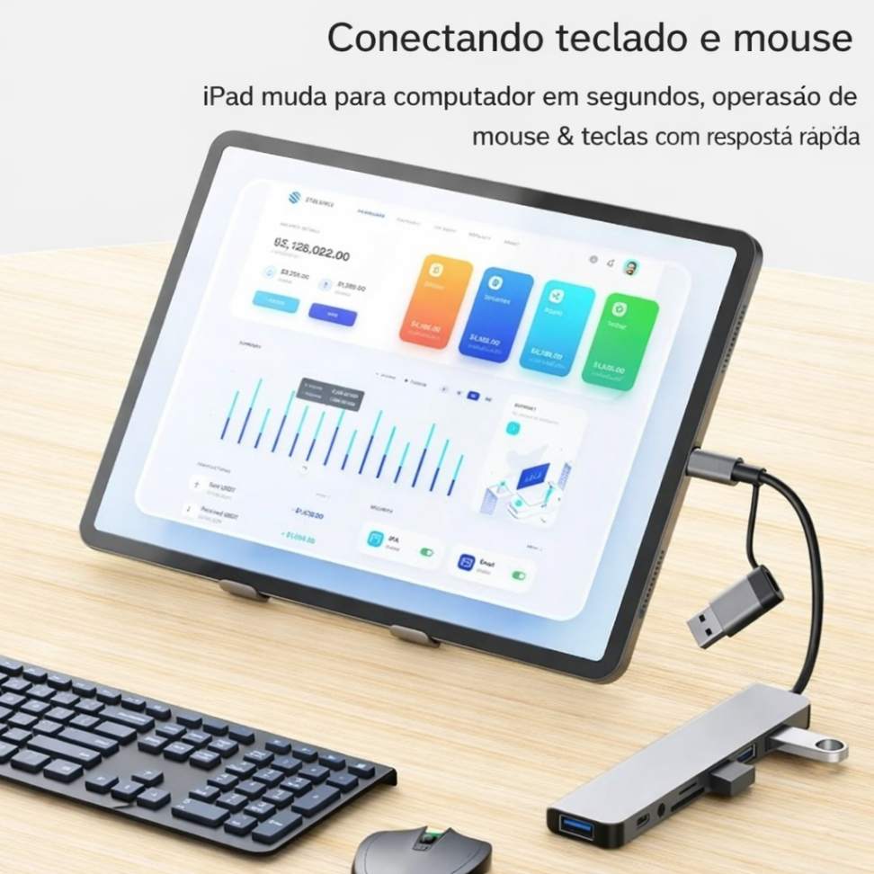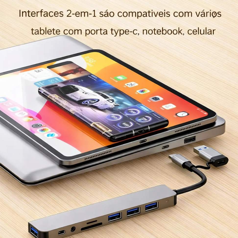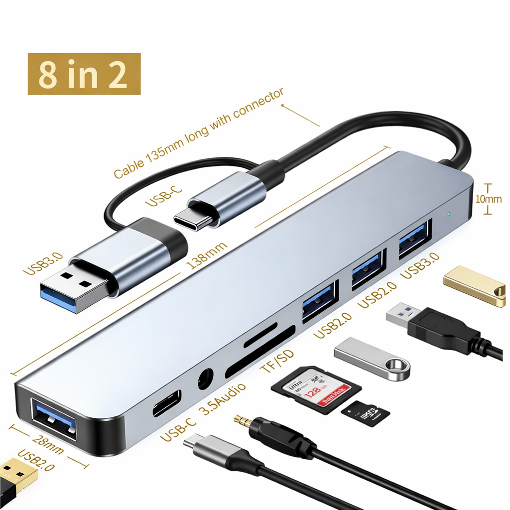 O Hub USB 3.0 8 em 1 é a solução ideal para quem precisa de mais portas e praticidade no dia a dia. Compacto, moderno e fabricado em liga de alumínio, ele transforma uma única entrada em múltiplas conexões de alta velocidade.