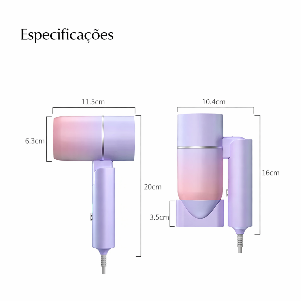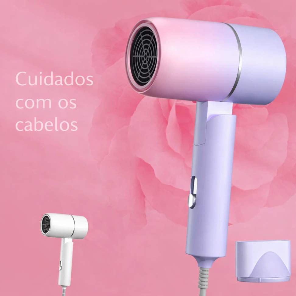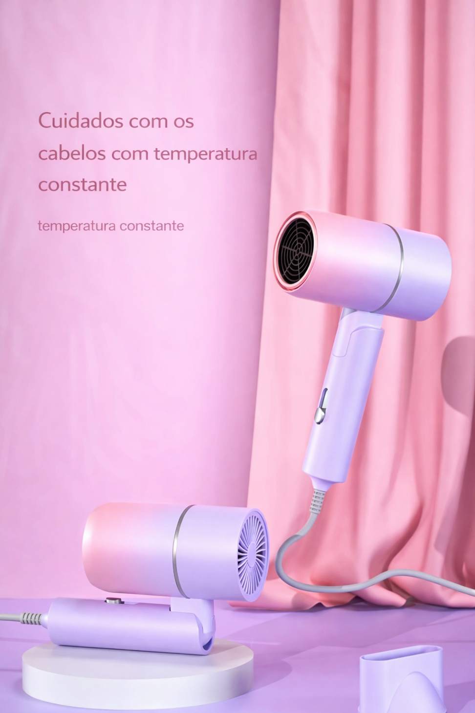 Com tecnologia de ar quente com ânion, ajuda a reduzir o frizz e proporciona um cabelo mais alinhado e com aparência saudável. Seu design com alça dobrável facilita o transporte, acompanhado de uma bolsa prática, ideal para levar na mala ou mochila.