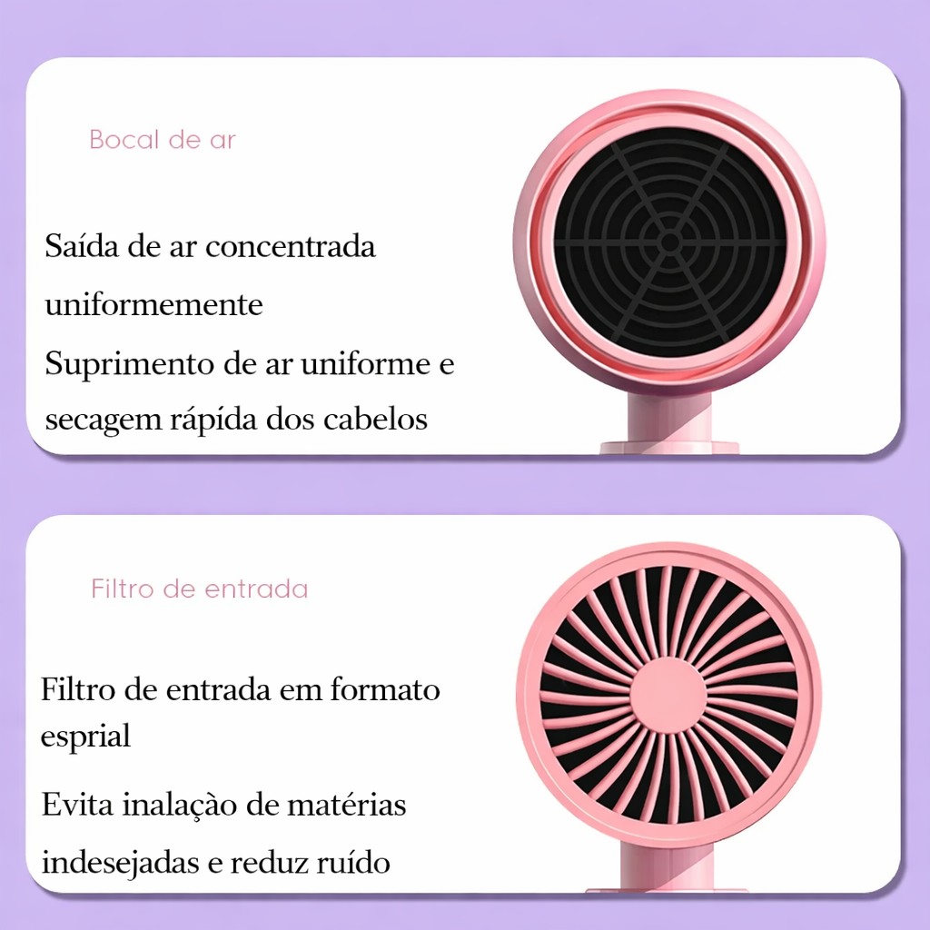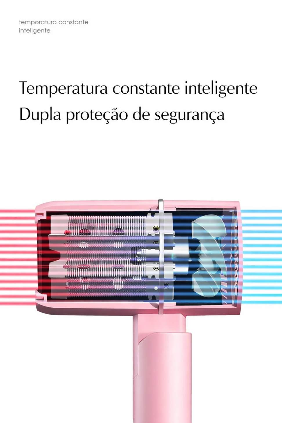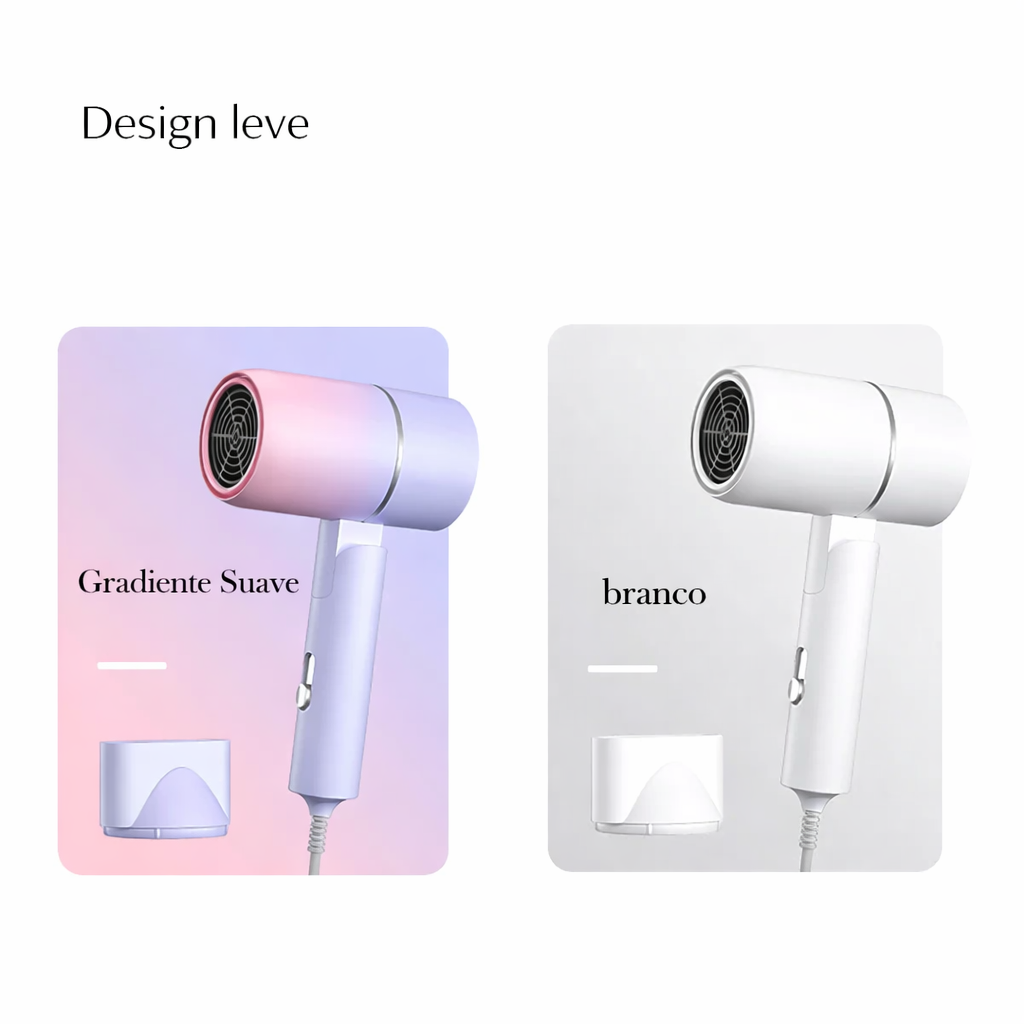 Com tecnologia de ar quente com ânion, ajuda a reduzir o frizz e proporciona um cabelo mais alinhado e com aparência saudável. Seu design com alça dobrável facilita o transporte, acompanhado de uma bolsa prática, ideal para levar na mala ou mochila.